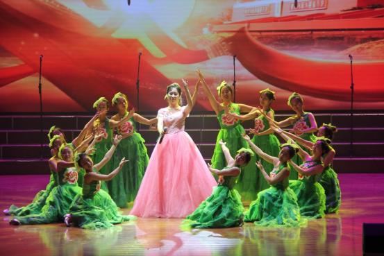 第二乐章:交响乐《红旗颂》、女声小合唱《英雄赞歌》、歌舞表演《赞歌》、舞蹈《唱支山歌给党听》。