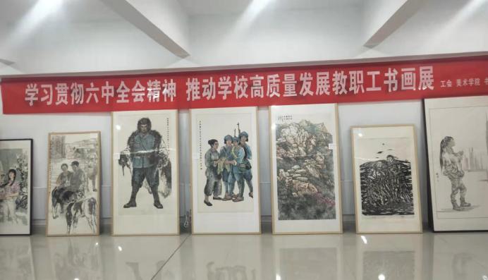 在建党百年之际,为了深入学习贯彻党的十九届六中全会精神,传承红色精神,铸牢中华民共同体意识,弘扬中华优秀传统文化,推进学校美育教育,加强校园文化建设,深化文明校园创建,推动学校“十四五”高质量发展,凝心聚力,鼓舞士气,12月9日下午,由校工会主办、美术学院和书画学会承办,在泉山校区逸夫楼十楼教工之家成功举办了庆祝建党百年主题教职工书画展览。