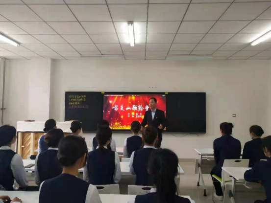 课堂上,现代服务学院院长王汉君和副院长武俊芳分别给学生详细讲解歌曲的写作背景及创作风格,通过“了解一段党史,学习一首歌曲”,在全体师生中形成“学党史”的风气,坚定学生爱党爱国的理想信念。