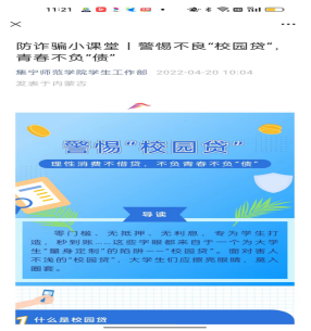 为了进一步完善学生诚信体系建设,提高学生金融安全领域的信用意识,加快在学生中营造“知信、用信、守信”的良好网络诚信意识宣传,PP电子游戏官网学生工作部(学生处)和各二级学院利用网络平台、微信公众号等宣传载体,共发布诚信教育宣传材料40余篇,宣传内容包括金融知识、征信知识、金融防骗知识、助学贷款还款办法等,引导在校学生树立良好征信观念,引导毕业生诚信离校。