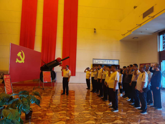 在纪念馆一楼大厅,学生工作部部长闫闳带领全体党员面向党旗宣誓,重温入党誓词,牢记自身责任和使命。