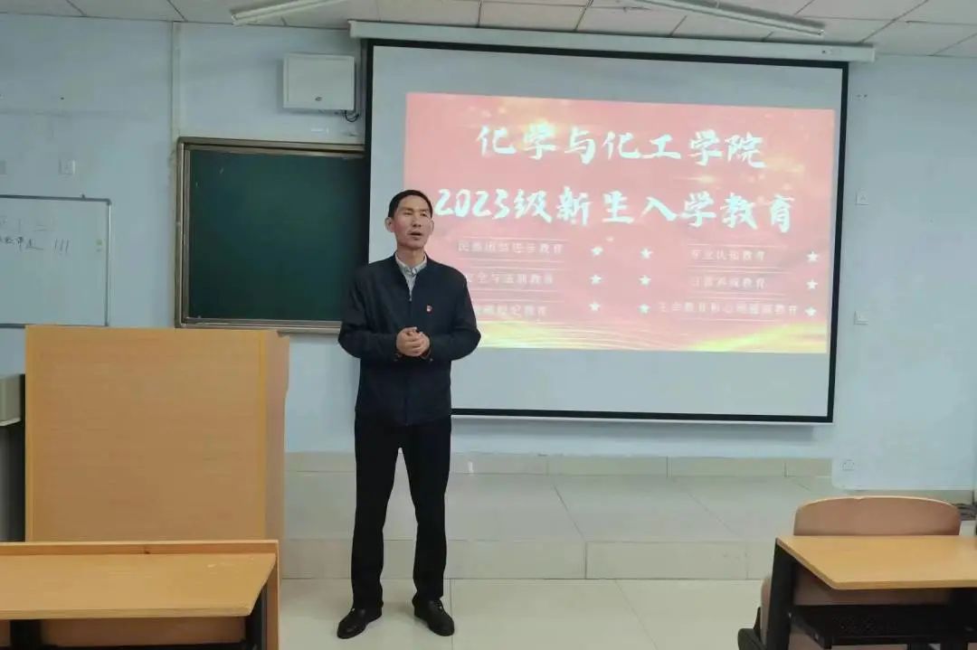 化学与化工学院党总支书记赵有军为新生开展了爱国主义和铸牢中华民族共同体意识入学教育。党总支副书记李强对校纪校规、学生综合测评相关规定、贫困生的认定与资助流程、国家与自治区奖助学金的评选规定做了解读。副院长王松涛为学生解读了学籍管理规章制度、人才培养方案等,使同学们更加明确了对未来大学生活的规划。团总支书记李欢讲解了团支部建设与团员发展等内容。