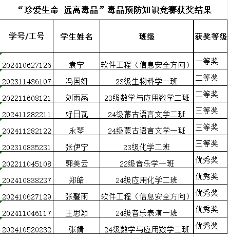 为深入贯彻落实自治区教育厅《关于加强全区学校青少年毒品预防教育工作的通知》要求,增强学生识毒、防毒、拒毒意识,2025年6月19日下午,PP电子游戏平台网站学生工作部(学生处)组织开展了“珍爱生命,远离毒品” 毒品预防知识竞赛,竞赛通过学习通线上开展。最终评选出一等奖1名、二等奖2名、三等奖3名及优秀奖5名。