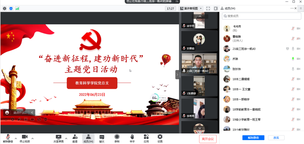 师生党员们集体观看了学习视频《奋进新征程建功新时代 ·走进老区看新貌》。学生党员代表们围绕活动主题精心准备了朗诵、演讲等内容,来表达对党、对祖国的无限热爱和最美好的祝福。