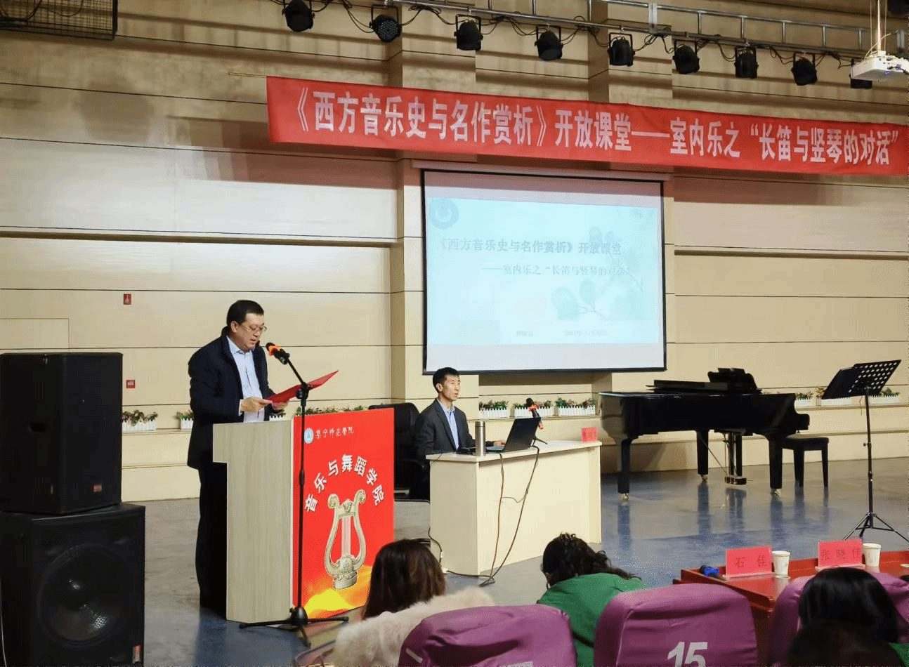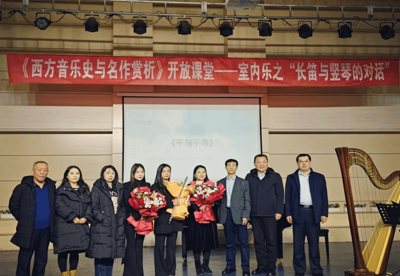2024年11月28日,PP电子游戏平台网站教务处与音乐与舞蹈学院共同举办《西方音乐史与名作赏析》开放课堂——室内乐之“长笛与竖琴的对话”活动。开放课堂上,贾晓嵩博士对巴洛克、古典主义、浪漫主义等不同时期的长笛与竖琴合奏作品导聆,帮助师生多角度理解作品。校党委委员、统战部部长赵向军,学院领导及全体教师参加本次开放课堂。