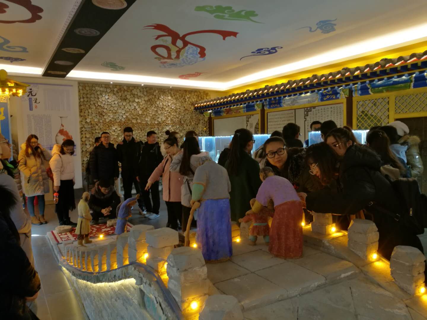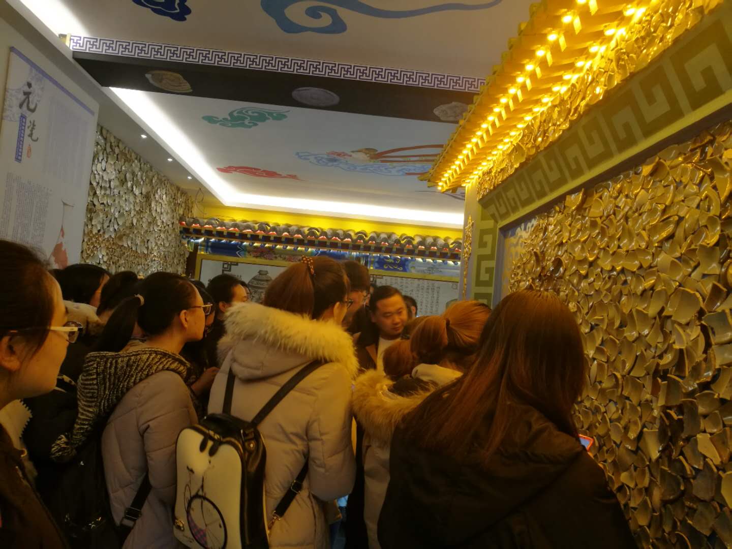 博物馆内主要陈列浙江龙泉瓷、钧瓷、景德镇的枢府瓷和定窑四大窑系瓷器。龙泉瓷分为梅子青、粉青、豆青三种瓷;钧瓷分为月白釉、天蓝釉、天青釉;枢府瓷分为影青瓷和卵白瓷两种,花纹大都是通过模印、画划或刻划的方法绘制而成;定窑以白瓷为主,是瓷中精品。这些瓷器大都由高岭土烧制而成,手艺精湛,是当代技术不可复制的珍贵瓷器。李老师在讲解时特别强调瓷器的“蚯蚓走泥纹”是鉴定瓷器类别与真伪的重要依据之一,并对如何辨别瓷器的来源及修复作了介绍。