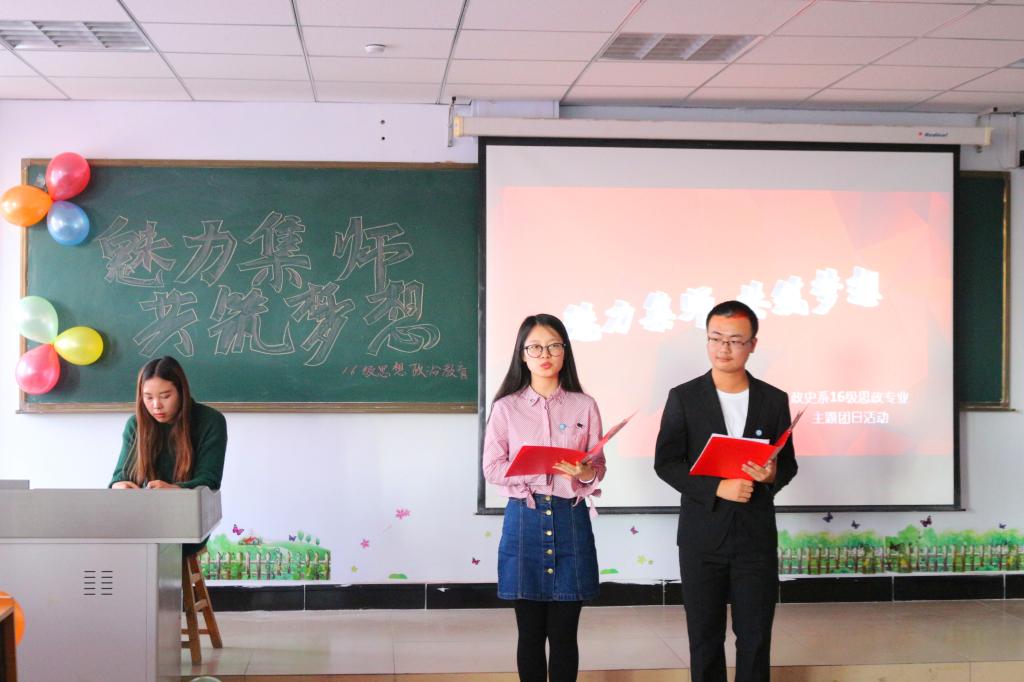 为进一步丰富校园文化生活,营造积极健康、高雅文明的校园人文环境,政史系思想政治专业团支部于9月28日下午,在主教楼420教室开展主题为“魅力集师,共筑梦想”的团日活动。参加活动的有杨福和主任、武勇副书记、团总支书记辛飞、学工办主任田博以及多位优秀青年教师。