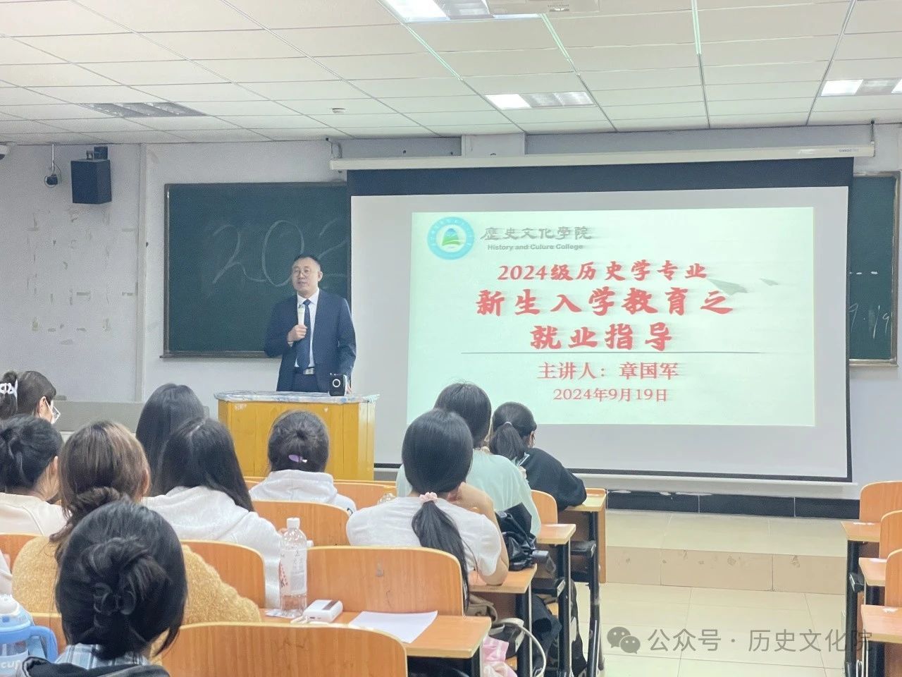 为深入学习贯彻习近平总书记有关安全工作的重要指示精神,全面落实《学生就业工作指南 2024 版》要求,切实保障师生生命安全与身心健康,营造安全、和谐、稳定的校园环境,全力做好学生就业等工作。2024 年 9 月 19 日,历史文化学院副院长章国军为新生开展了以大学生涯规划为主题的入学教育活动。