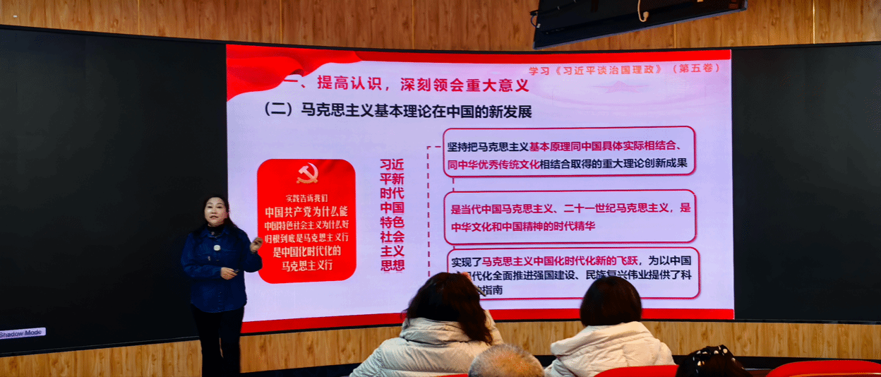 讲座中,晓荣老师紧扣《习近平谈治国理政》第五卷的核心要义,从时代背景、理论创新、实践要求三个维度展开解读。她系统梳理了著作收录的91篇重要文献脉络,深入阐释了“两个结合”的丰富内涵,重点解读了中国式现代化、高质量发展、党的自我革命等重大命题的理论逻辑与实践路径。晓荣老师结合鲜活案例,将抽象理论与基层实践相结合,既解读了“以人民为中心”的发展思想,又阐释了统筹发展与安全的战略考量,让听众深刻领会到习近平新时代中国特色社会主义思想的真理力量和实践伟力。