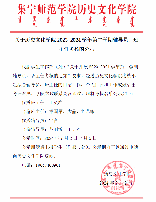 关于历史文化学院2023-2024学年第二学期辅导员、班主任考核的公示