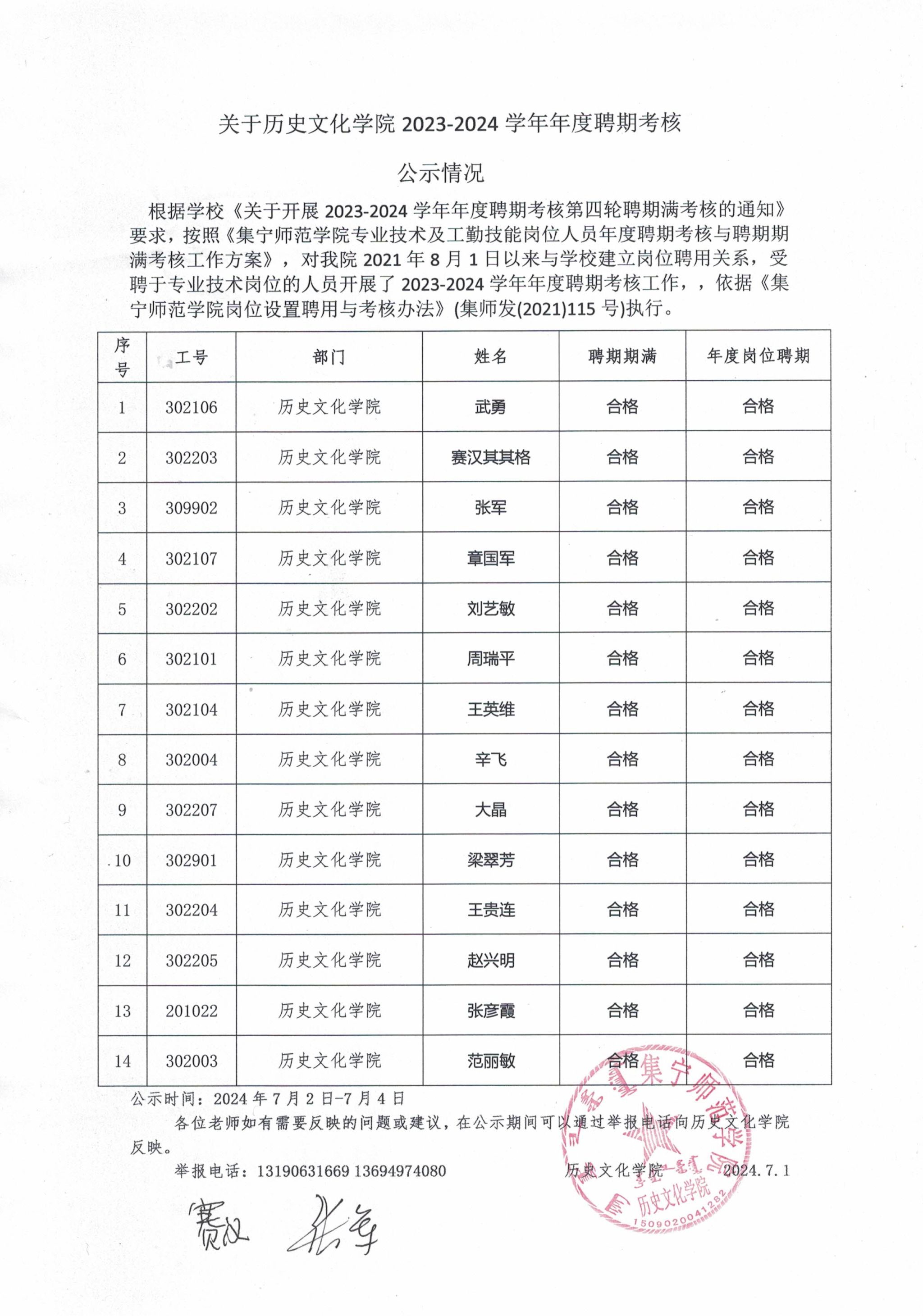 关于历史文化学院2023—2024学年年度聘期考核公示情况