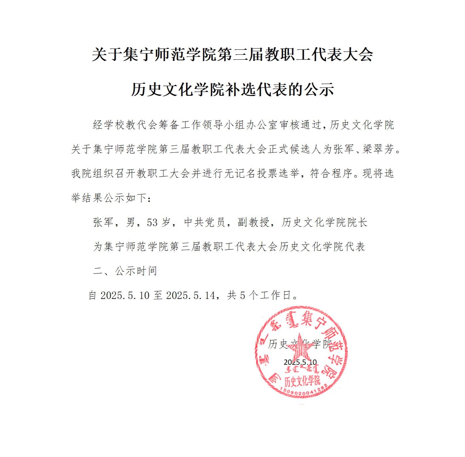 关于PP电子游戏平台网站第三届教职工代表大会 历史文化学院补选代表的公示